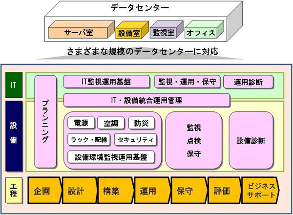 本サービスは、データセンター事業者をはじめ、サーバ室を自社で運用している企業、これからデータセンター事業を開始する企業、サーバ室を構築する企業に向け、立地調査から建物の企画・設計、データセンターに付随する各種設備機器の設置、施工、運用・保守、ITシステムの構築・運用、評価、改修まで、データセンターやサーバ室のライフサイクル全般をトータルにサポートするものです。