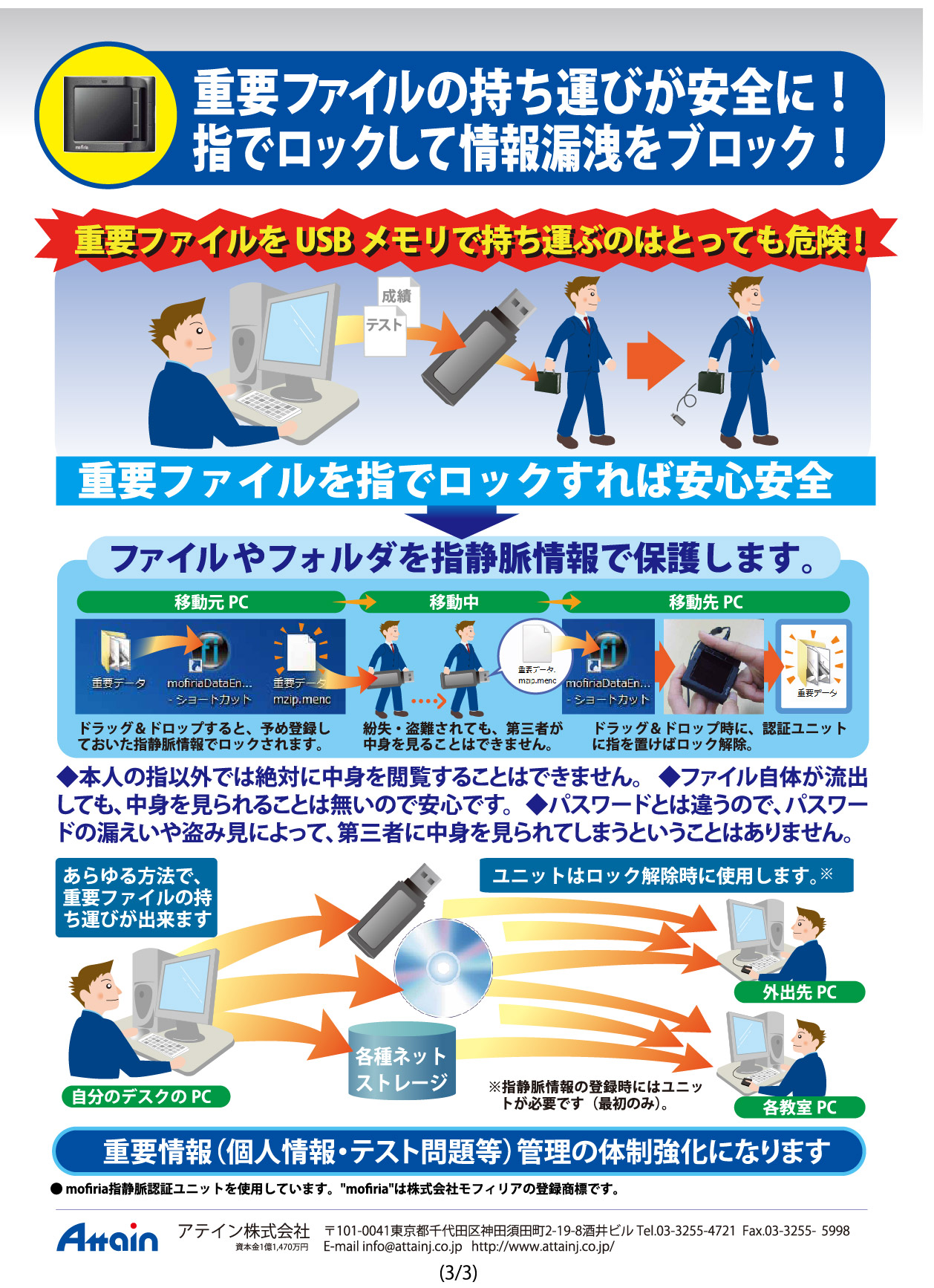 コンピュータ周辺機器販売のアテイン株式会社(本社:東京都千代田区神田須田町2-19-8酒井ビル、電話:03-3255-4721、代表取締役:本多成人、資本金:1億1470万円)は、株式会社モフィリア(東京都品川区西五反田2-13-6セラヴィ五反田ビル7階、電話:03-6417-9411、代表取締役:天貝 佐登史、資本金:4,325万円)開発のUSB接続の指静脈認証ユニットを使用した、指静脈情報によってファイルやフォルダを本人以外閲覧不可状態にすることで情報漏洩対策とする指静脈認証ソリューションの提供を、企業や教育機関向けに6月1日より開始します。