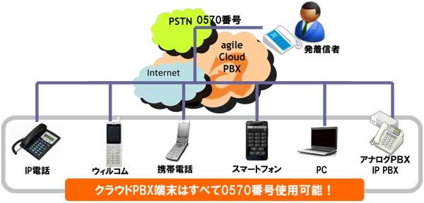 0570番号を、どのアジルフォン端末でも発着信することができます。IP電話機だけでなく、ウィルコム端末や携帯電話、スマートフォン、PCなどでも可能です。インターネットの環境さえあれば、国内外どこからでもご利用可能です。