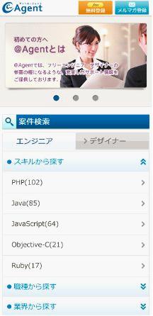 @Agentは、業界トップクラスの案件数でWeb系プロジェクトを中心に毎月150件以上の新規案件を掲載しているサイトです。 創業から注力してきたPHPやJAVAの案件や今注目を集めているスマートフォンアプリ、オープンソーシャルの最新案件を毎日更新しています。