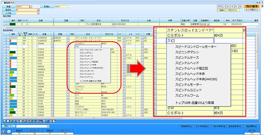 部品の情報を登録する際に品番や品名の初めの数文字を入力すると、候補となる単語を表示し選択できるようになりました。候補となる単語はマスタから検索する方法と、過去の履歴データから検索する方法と2種類用意し、より適切な候補単語を抽出できるようにしております。入力ミス防止と入力工数削減に貢献します。