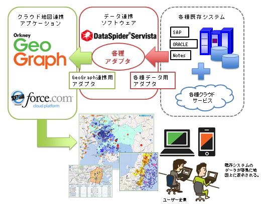 40種類を超えるアダプタ機能を持つデータ連携ミドルウェアDataSpiderがOrkney GeoGraphと連携することで、これまでOrkney GeoGraphとスムーズに連携が行えなかった、SAP や Notes、Oracleなどオンプレミスのシステムからクラウド上のデータまで様々なデータと地図との連携がノンプログラムで短期間に実現します。これによりユーザー企業は、容易に既存システムと地図連携を実現し、迅速に地理情報システム(Geographic Information System)を構築できるようになります。個別データ連携開発とは異なり、今後の追加連携への拡張性・柔軟性が確保されるため、さらなる開発コスト削減効果も期待できます。
