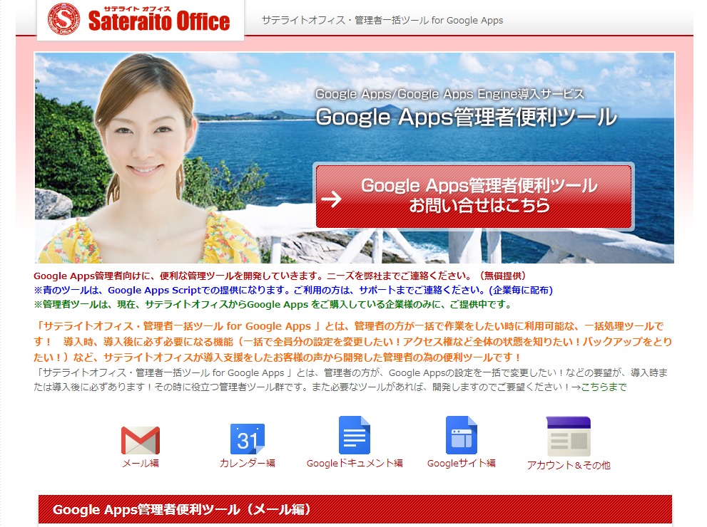 サテライトオフィスは、Google Apps 導入支援の中で、Google Apps で利用可能な、シングルサインオン機能、ワークフロー機能、組織カレンダー機能、組織アドレス帳などを無償提供しております。今回は、Google Apps 管理者の方から非常に要望が多かった機能で、Google Apps ユーザーのパスワードを一括で変更する機能と事前にユーザーにメール告知する機能を、Google Apps Scriptで、プログラム開発し、管理者ツールとして無償公開いたします。