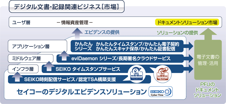 セイコーソリューションズ株式会社は、デジタル文書・記録管理市場に、「信頼の時」をコアとする基盤技術で時刻認証サーバやタイムスタンプサービス・長期署名サービスなど、装置からサービスまでデジタル情報の完全性を担保するソリューション(デジタルエビデンスソリューション)を提供しています。