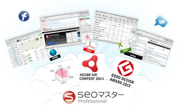 seoマスターProfessionalは、2011年のAbobe(アドビ)エアーコンテンストで『エンタープライズ賞』を受賞、2012年のグッドデザイン賞も受賞しました。さらに、2012年からジャストシステムが発売しているホームページビルダー17にseoマスターの一部機能が実装されるなど、多方面から高い評価を受けています。