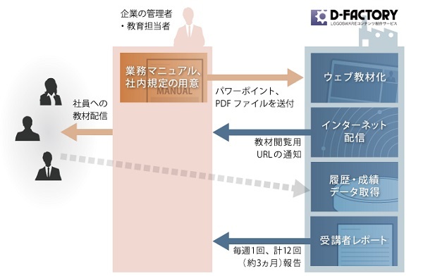 このサービスを利用すると、企業は教育素材となる資料を、PDFやパワーポイントの形式で入稿するだけで、社員に対するオンライン教育の実施とその結果集計が可能になります。デジタル教材化、Web配信、結果レポートは全てロゴスウェアから提供されるので、利用企業はITシステム類の準備が一切不要です。