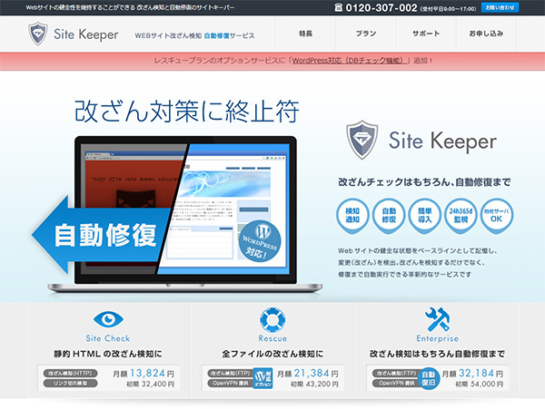 Site Keeperは、JNS株式会社が開発した「isAdmin」を採用した、WEBサイト改ざん検知/自動復旧サービスです。レスキュープラン(月額¥21,384)のオプションサービスとして「WordPress対応プラン」(月額¥5,400)の提供を開始いたします。データベース更新の仕様が明確な場合は、WordPressだけでなく独自開発のプログラムでもご利用いただけます。