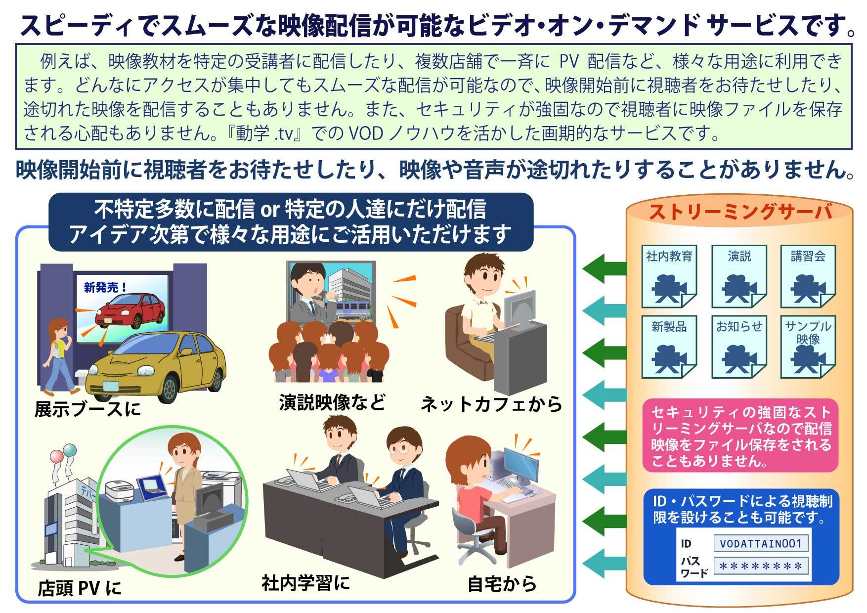 近年の世界的なトレンドからみるに、DVDやCDなどのパッケージソフトは低調な一方で、PCや携帯電話向けのコンテンツ配信は好調に伸びている。このような状況から、最近では自社のコンテンツをネット上で配信したいとの要望が寄せられることもあり、同社では長年のメディアエンコードのノウハウと『動学.tv』の技術を生かしたオンデマンド配信サービスを提供する。