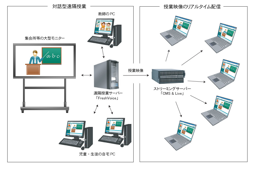 また、最大の特徴は、対面での対話型授業だけではなく、その様子をリアルタイムに多数のPCやタブレット向けにビデオ配信することができるところにあります。