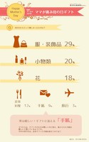 「OKWave」全体の質問者の男女比率は男性の方が多い(57%)傾向ですが、『母の日』に関する質問投稿は女性が79%を占めました。「OKWave」全体の質問数に対する年ごとの質問数比率を分析すると、2012年以降、質問数が増加傾向となりました。質問内容では「プレゼント」について気を遣って悩んでいる傾向が見られました。プレゼントの内訳について2009~2010年と2013~2014年の傾向を比較すると、「服・装飾品」が減少し、「食事・料理」が増加していました。一方で2013~2014年の質問に対する回答内容を分析すると、もらって嬉しかった『母の日』のプレゼントは「服・装飾品」が最も多く、プレゼントを贈る側と受け取る側で意識の違いが見られました。また、受け取って嬉しかったものとしてプレゼントそのものよりも添えられた「手紙」を挙げる声も見られました。2012年以降の質問数の増加と合わせて、2011年を境に質問内容の傾向にも変化が見られ、プレゼントの多様化や「喜ぶ」など相手の感情を気にするワードが出現するようになりました。3.11震災を境に心境に変化が生じ、母親への感謝、喜んで欲しいという気持ちが強くなっている様子がうかがえます。