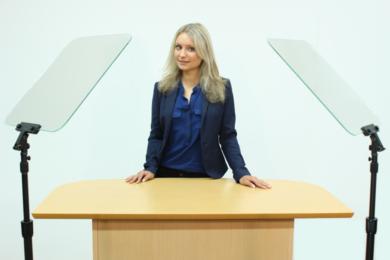 スピーチプロンプターは聴衆側には見えないように、透明なガラス板にスクロールする原稿を表示させる装置です。今回はスピーチプロンプターと株主総会向けに最適な機材とを一纏めにしたセットの販売とレンタルを開始します。