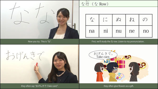 内容としては、ひらがなの発音と書き方、カタカナの発音と書き方、長音、撥音、促音、拗音、アクセント、あいさつの会話と表現を学習することができます。またすべての音声に英語字幕が付いているので、全くの日本語初心者でも学習することができます。
