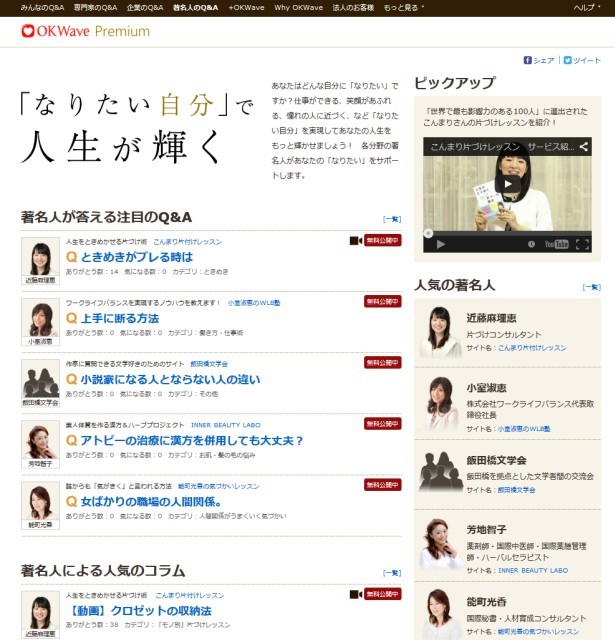 『OKWave Premium』では、米TIME誌「世界で最も影響力のある100人」に選出された片づけコンサルタントの近藤麻理恵氏の片づけメソッドが学べる「こんまり片づけレッスン」。平野啓一郎氏、田中慎弥氏、柴崎友香氏ら、日本国内外で活躍する作家や、東京大学教授のロバート・キャンベル氏、同准教授の武田将明氏ら文学者との文学を通じた交流の場「飯田橋文学会」。ワーク・ライフバランスの第一人者の小室淑恵氏がワーク・ライフバランスの実践方法をアドバイスする「小室淑恵のWLB塾」。グローバルな視点を持った秘書としての豊富な経験を基にしたベストセラー著作シリーズを持つビジネス書作家の能町光香氏の「能町光香の気づかいレッスン」。薬剤師免許、国際中医師免許、ハーバルセラピスト資格等を持つ漢方美容研究家の芳地智子氏監修、美しく、健康でいたい女性に、東洋医学の理論を基にした新たな健康&美容法をおとどけする「INNER BEAUTY LABO 美人体質を作る漢方&ハーブプロジェクト」など、“なりたい自分”を目指すユーザーを著名人がサポートするQ&Aサービスを提供しています。