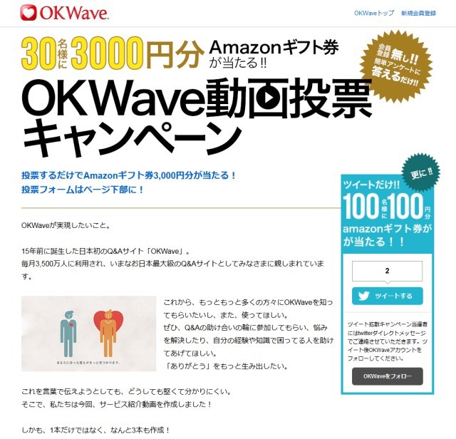 本投票キャンペーンはそれらの紹介動画を広くご覧いただき、どれが最も「OKWave」を感じられるかを投票していただきます。なお、投票した方の中から抽選で30名様にAmazonギフト券3,000円分を進呈します。また、本投票キャンペーンページをTwitterで紹介していただいた方の中から抽選で100名様にAmazonギフト券100円分を進呈します。