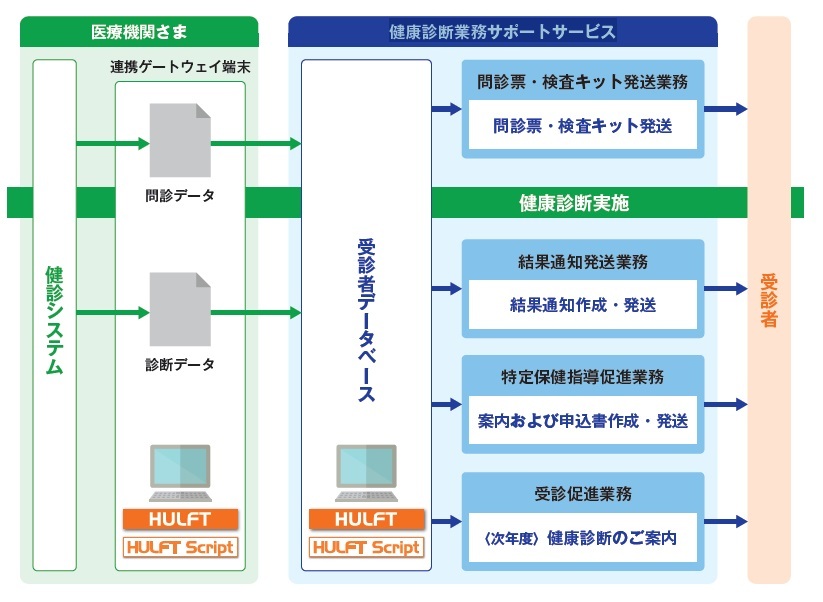 共同印刷西日本は、「健康診断業務サポートサービス」業務におけるセキュリティ対策として、閉域網(閉域IP網)の利用に加えて、全国の金融機関や大手製造業を中心に8,400社以上の導入実績があるファイル連携ミドルウェア「HULFT」を採用しました。これは、ファイル転送時の暗号化(独自方式・AES方式・C4S方式)や、転送データの欠落や改ざんを防止するデータ検証機能、指定ファイル以外の送信を防止するガバナンス機能などを評価した結果です。もうひとつの課題である煩雑な処理による業務負荷に対しては、ファイル操作や加工に関連する一連のプログラムをノンプログラミングで簡単に作成できる「HULFT Script」で解決しました。医療機関のスタッフは、特定のフォルダにファイルをドラッグするだけで、自動処理が実行されます。「HULFT」と「HULFT Script」の採用により、安全・確実なファイル転送と医療機関側の運用負荷低減を実現しました。