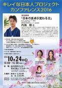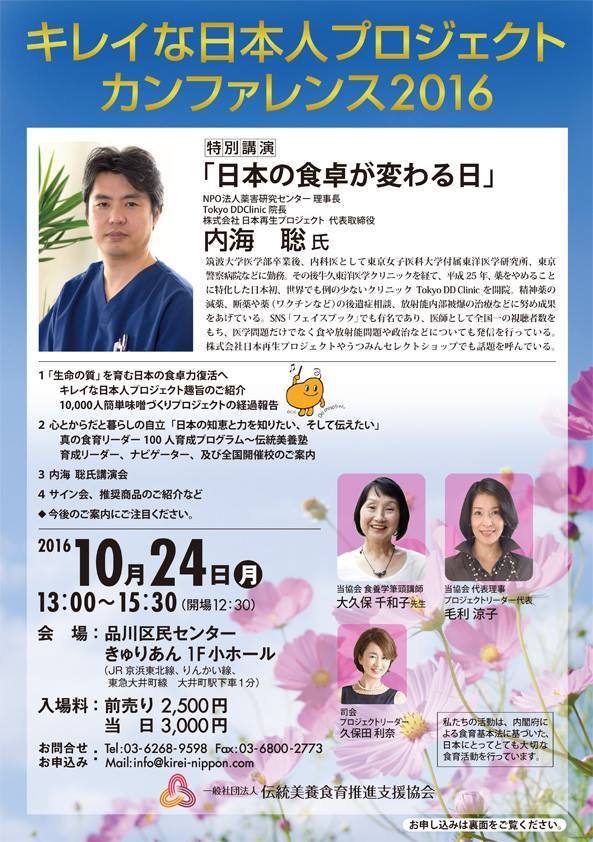 日本の伝統食を、心と体の美養食として世界へ発信する、一般社団法人「伝統美養食育推進支援協会」(本部:東京都千代田区、電 話:03-6268–9598、代表理事:毛利涼子)は、2016年10月24日(月)に、キレイな日本人プロジェクト カンファレンス2016として内海聡氏による「日本の食卓が変わる日」の講演会を開催します。(後援:アテイン株式会社)