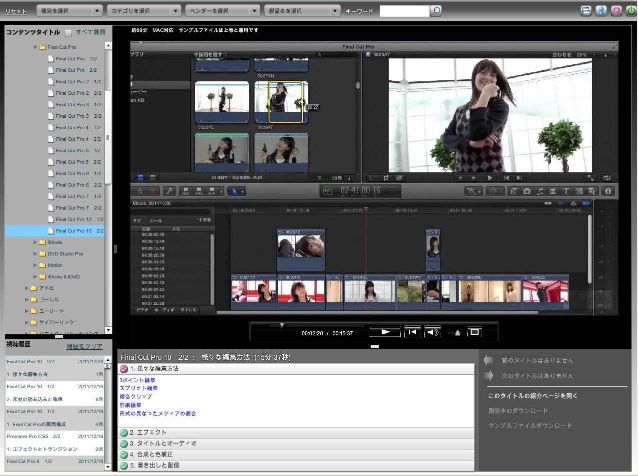 今回提供開始する「映像制作をはじめようFinal Cut Pro X」は、Final Cut Pro Xに関する基礎的な部分の解説から応用まで網羅した、充実した内容の教材です。内容は、基本・応用・追加機能の3つのセクションにわかれています。基本ではFinal Cut Pro Ⅹの画面構成や、素材の読み込み、新規プロジェクトの作成、ビデオ編集の基本を学習。応用では、映像作品をより印象的にするエフェクトや、合成の方法、作成したビデオの出力や、Webへの公開方法などより実践的な学習を行います。すでに「Final Cut Pro」をお使いで、新しいバージョンの操作になれたいという方にも最適な教材です。
