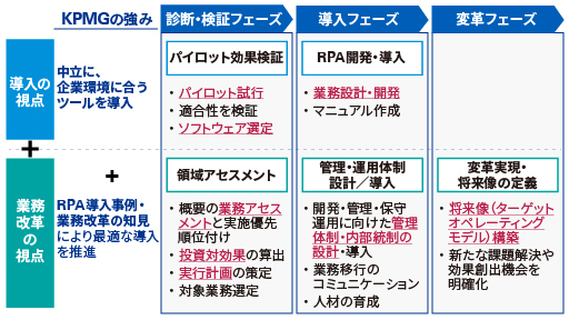 KPMGコンサルティングでは、経費精算や買掛金業務といった経理部門の業務をはじめ、契約申込処理業務や36協定チェック業務など、バックオフィス及び事業部門の定型業務を自動化するClass 1と言われるRPAを、国内外のRPAベンダー企業と連携し、金融業界、保険業界、テクノロジー業界、エネルギー業界、製造業、官公庁など、20社を超える企業や組織に対し、導入から運用ポリシーの構築までの支援サービスを提供してきました。