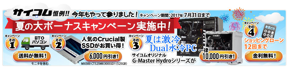 BTOパソコンメーカーの株式会社サイコム(本社:埼玉県八潮市/代表取締役社長:河野 孝史)は、コストパフォーマンスと豊富なパーツ選択で人気を誇る同社のBTOパソコン直販サイトにおいて、毎年恒例の感謝イベント「夏の大ボーナスキャンペーン!」を、6月16日(金)14:00より7月31日(月)24:00までの期間で開催します。