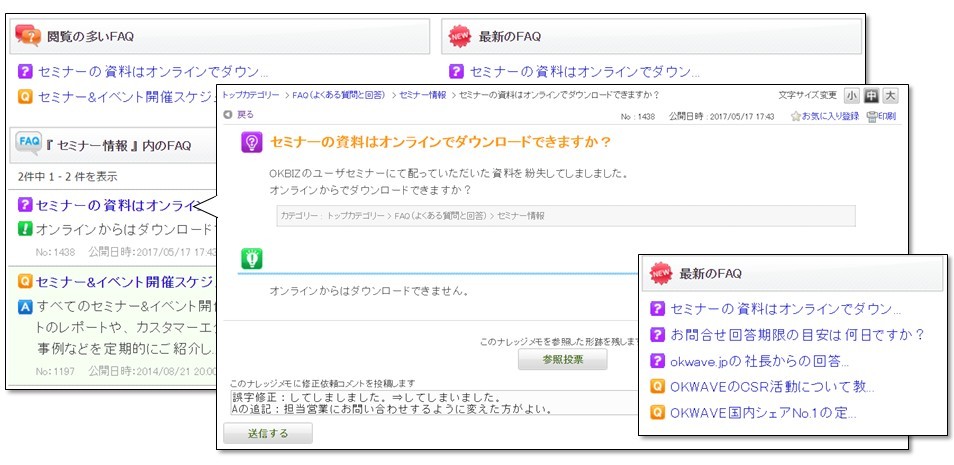 『OKBIZ. for FAQ / Helpdesk Support』は、「FAQ」(よくある質問とその回答)を活用して、顧客らからのお問い合わせ対応業務の平準化と効率化を図り、サポートコストの削減ならびにCS(顧客満足度)の向上や売上の促進を支援するFAQ/お問い合わせ管理システムです。