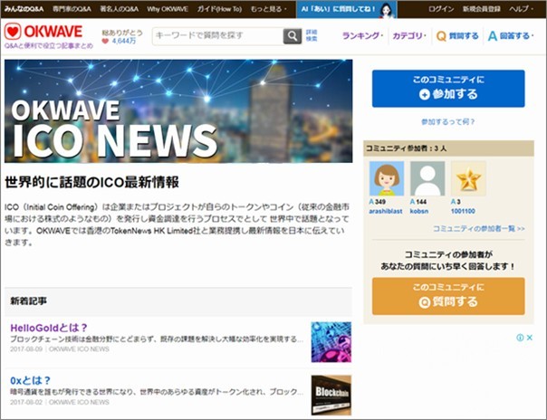 当社が運営するQ&Aサイト「OKWAVE」内にICOに関する情報サイト「OKWAVE ICO NEWS」を開設します。Token News HK Limited社が発信するICOや暗号通貨に関する最新トレンドや分析レポートを掲載する他、当社でも独自のICOに関する考察や分析レポートを発信していきます。