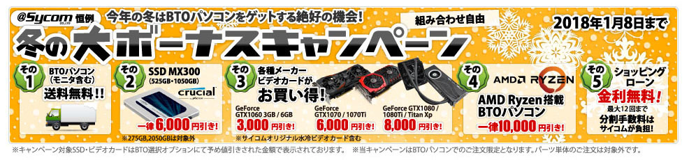 BTOパソコンメーカーの株式会社サイコム(本社:埼玉県八潮市/代表取締役社長:河野 孝史)は、コストパフォーマンスと豊富なパーツ選択で人気を誇る当社BTOパソコン直販サイトにおいて、年末恒例となった感謝イベント「冬の大ボーナスキャンペーン」を、11月22日(水)13:00より実施します。