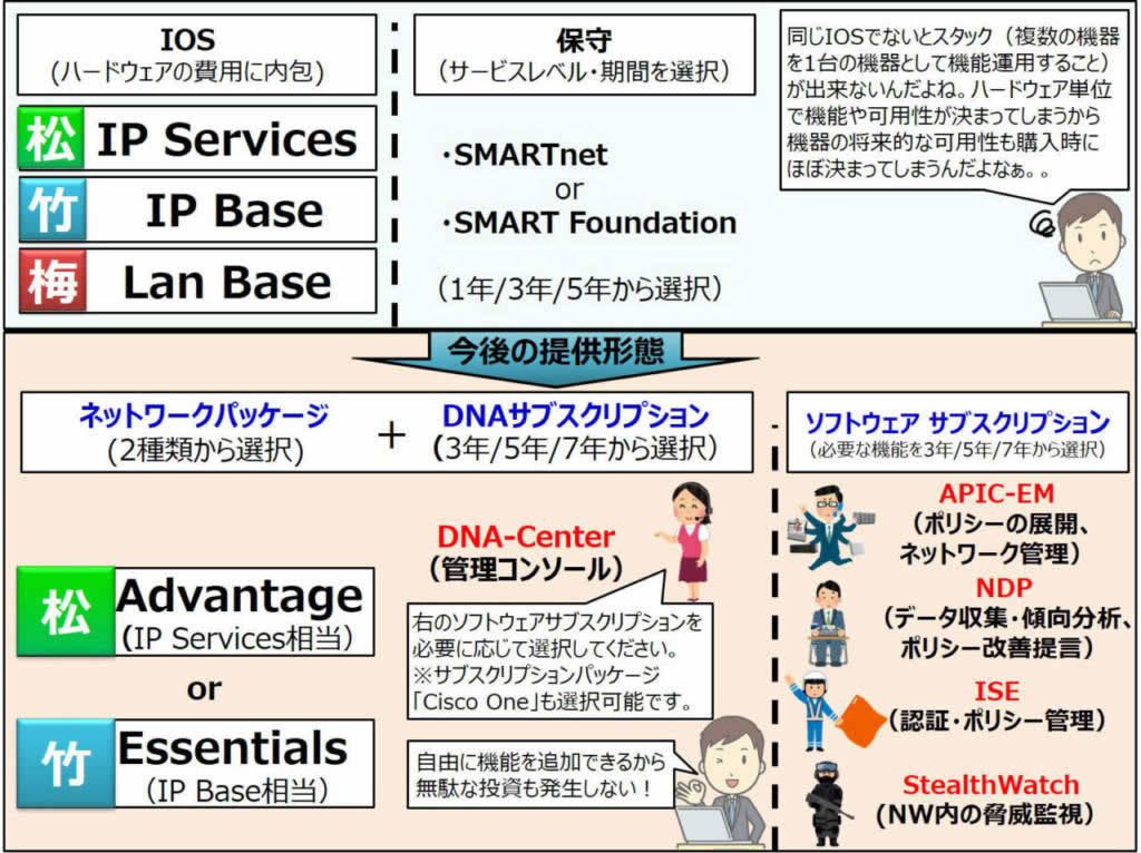 というランク分けがあります。IOSの費用は本体価格に内包されているため『高価な機器を購入すること』=『高性能なIOSを購入すること(それだけ性能・可用性が高い)』 ということになりますが、実は『同じランクのIOS同士の機器でないと組み合わせてわせて使えない』という問題がありました。「SMARTnet」や「SMART Foundation」といった保守がありますが、それらはハードウェアの性能を劇的に改善できるものではなく、あくまでハードウェア保守・機能改善・バージョンアップ権利を担保するものです。この提供形態では、ハードウェアを最初に購入した時点で、機器の性能と将来の可用性がほぼ確定してしまうということになります。