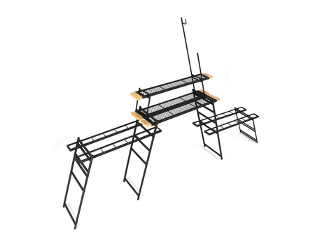 プレートやワンバイ木材を差し込むための脚が3本セットになった製品です。 組み合わせ次第で、キッチンとツーバーナースタンドが完成します。 ツーバーナーの高さや形状に応じて、スタンドの高さも2段階で変更可能。 組み上げたキッチンやスタンドの下部にプレートや木材を入れれば、ウォータージャグや食器などを置くスペースを必要に応じて作り出せます。