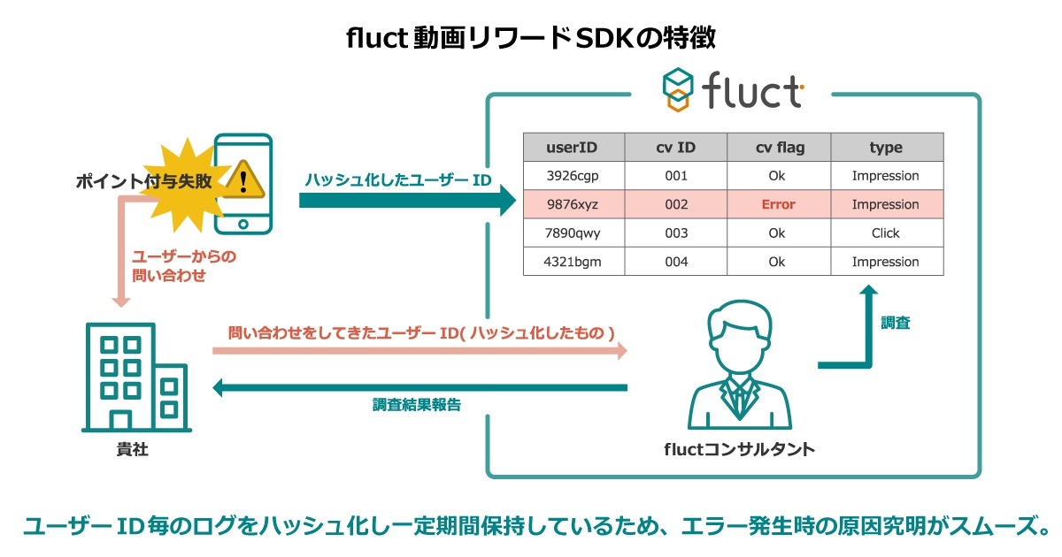 メディエーション機能を持つ従来の動画リワードSDKでは、報酬付与が失敗した際や、アドネットワークのSDKがクラッシュした際、原因となるアドネットワークの特定が難しく、原因究明やサポートに大きな課題がありました。fluctでは、ユーザーID毎のログをハッシュ化し、一定期間保持することで、スムーズ且つ迅速な原因究明を可能にしました。