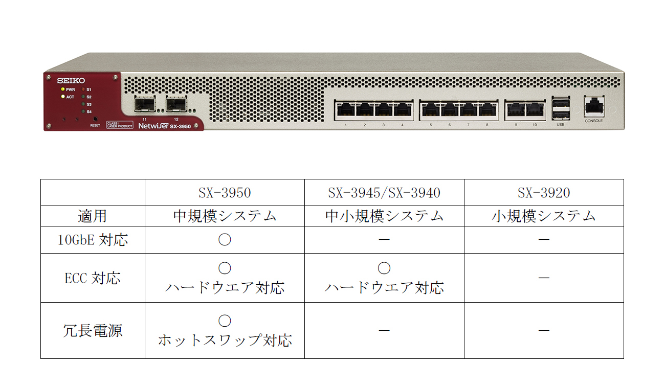 今回発表のNetwiser新シリーズは、これらの要望にお応えし、最上位モデル「SX-3950」で10GbEのLANインターフェース(2ポート)と冗長電源(ホットスワップ対応)を標準搭載しました。「SX-3950」とミドルモデルの「SX-3945/SX-3940」では、SSL処理能力が従来機種の約5倍に向上したハードウエアオプションを搭載可能で、ECC対応を処理能力の高いハードウエアで行うことで、従来のソフトウエア処理に比べ高いパフォーマンスを実現しています。