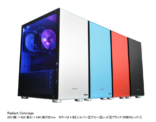 最大の特長であるアルミ筐体のカラーバリエーションは、シルバー、ブルー、レッド、ブラック(内部はレッド)の4色を揃えています。インテリアの一部としてパソコンの購入を検討しているユーザーは、設置する空間に合った配色から製品を選ぶことができます。また、BTOパソコンなのでストレージやメモリー、ビデオカードなどの内部パーツは、オプションによるカスタマイズが可能で、自分好みのスペックに変更できる自由度も魅力です。価格は、Intel(R) Core(TM) i5-8400搭載モデルが162,560円(税込)より。従来の販売製品同様に受注(受付)後7営業日以内での納品を見込んでいます。