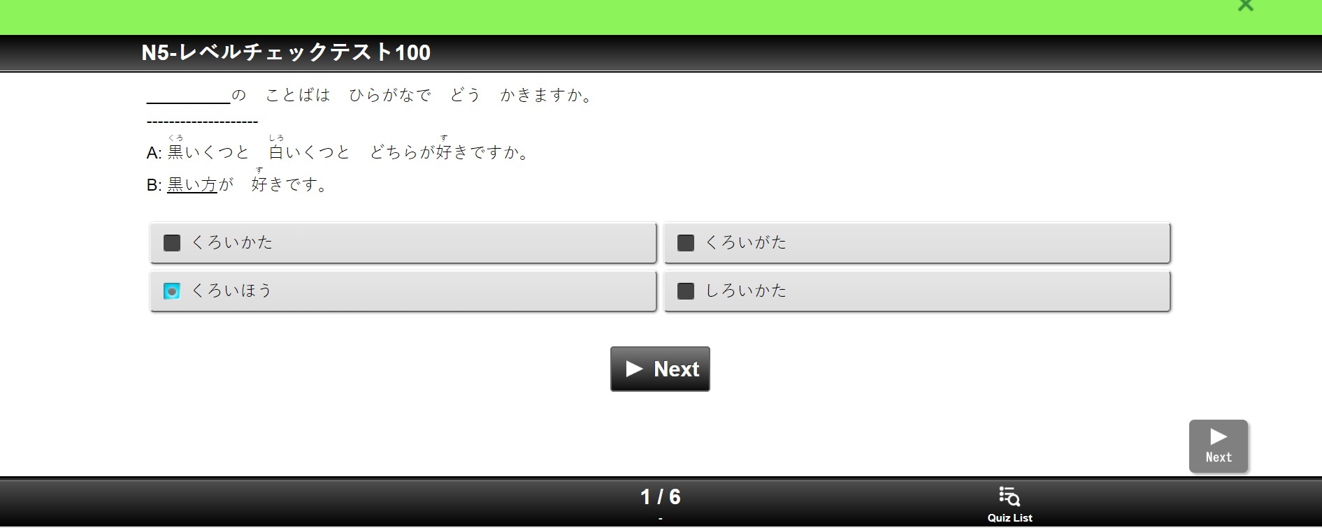 「日本語能力試験レベルチェックテスト」は語彙、文法の小テストと聴解小テストが組み合わさったものです。日本語能力試験の各レベルから100問以上の小テスト問題を用意し、その中に語彙文法6問、聴解3問でランダム出題するテストです。N5からN1まで五つレベルがあります。このテストは受講者の日本語レベルを判定するテストです。テストを受ける結果によって、受講者は何のレベルのコースから始めるのがいいのかわかります。大変便利な機能となります。