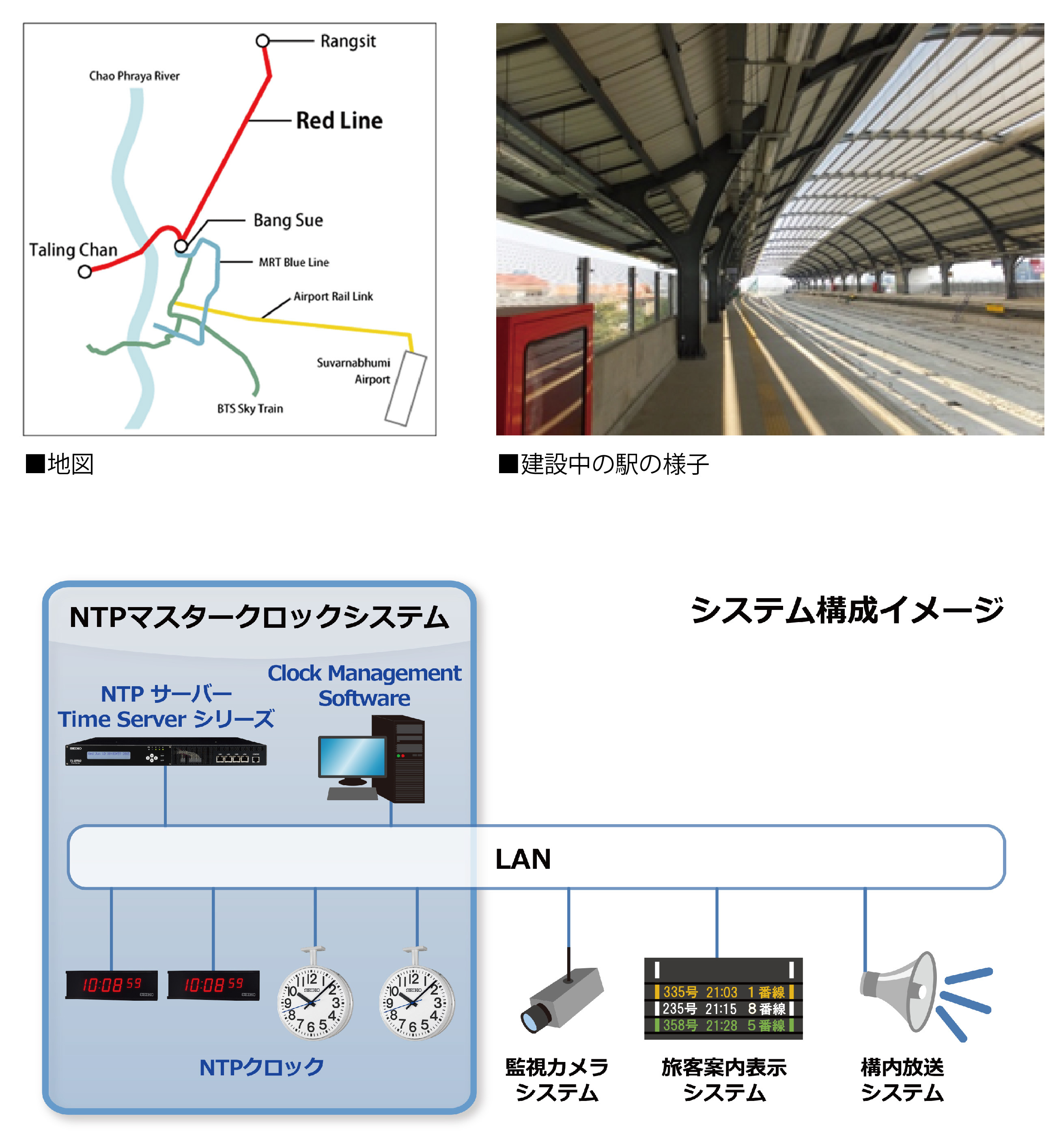 当社は、駅構内時計設備システムとして、NTPサーバー、NTPクロック、ならびにNTPクロックを一元的に設定・監視する「Clock Management Software」を組み合わせたトータルソリューション「NTPマスタークロックシステム」を提供します。NTPクロックは、NTPサーバーの時刻に同期するため、従来の設備時計システムのように手動や電波による補正が必要ありません。また、NTPサーバーは、NTPクロックの時刻表示だけでなく、LANにつながった監視カメラシステム、旅客案内表示システム、駅構内放送システムなどのシステム時刻も同期させ、円滑な鉄道運営を支援します。