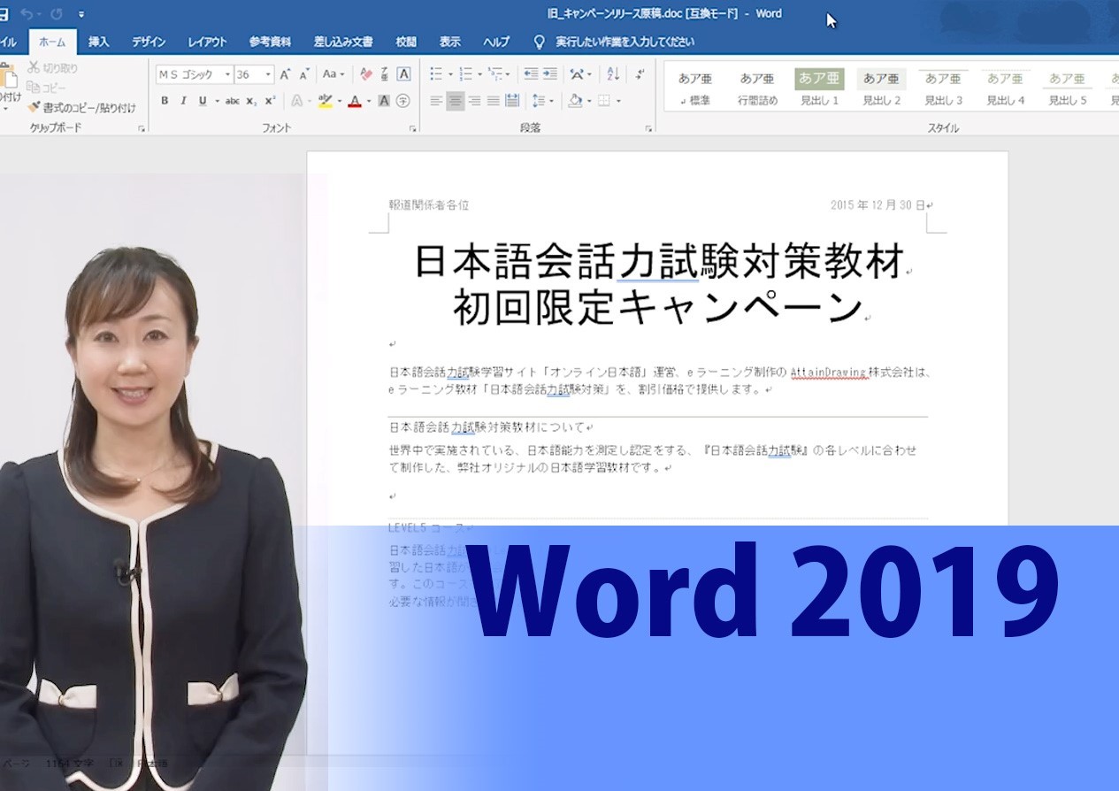 「Microsoft Word 2019 使い方」講座では、Wordの基本的な使い方を身に付けることができます。具体的には上巻では、文字の入力や変換、段落の書式設定など、文書を作成するための基本的な機能を中心に学習します。下巻では、表を使った文書作成や図形・写真の利用方法など、ビジネスや趣味でも利用できる便利な機能を中心に学習します。