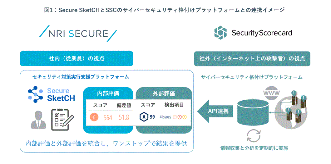 Secure SketCHは、情報セキュリティ担当者がWebサイト上で約80の設問に回答することで、国内を中心とした1,800社以上の登録データと比較しながら、内部評価を行った結果を得られます。その有効性から、Secure SketCHは計800社以上の企業に利用されてきました。今回加わる新機能では、担当者が設問に回答する必要はなく、外部評価の結果が点数(スコア)として自動的に算出され、毎日更新されます(図2)。担当者は、内部評価に加えて、外部評価の結果を同一の画面で随時確認できるようになるため、セキュリティ業務のさらなる効率化・高度化が期待できます。