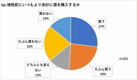 最初に消費税が10%に引き上げられる前に、いつもより余計に酒類を購入するかどうかを聞いたところ、「買う」と「たぶん買う」は合わせて51%と半数を超えました。反対に「買わない(「たぶん買わない」を含む)」は36%に止まります。わずか2%の税率引き上げですが、よく酒を飲む方の半分以上が、ふだんより余計に酒を購入しそうです。
