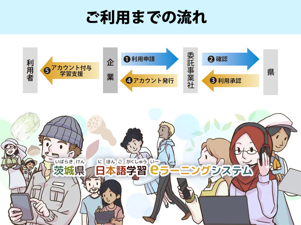 「茨城県外国人向け日本語学習支援e-ラーニングシステム」は、茨城県が県内外国人の日本語能力の向上や就労に必要な知識の習得等を図り、地域住民との共生、県内企業で円滑に就労できる環境を整備することを目的として、県内企業及び在住外国人の方に無償で提供するものです。