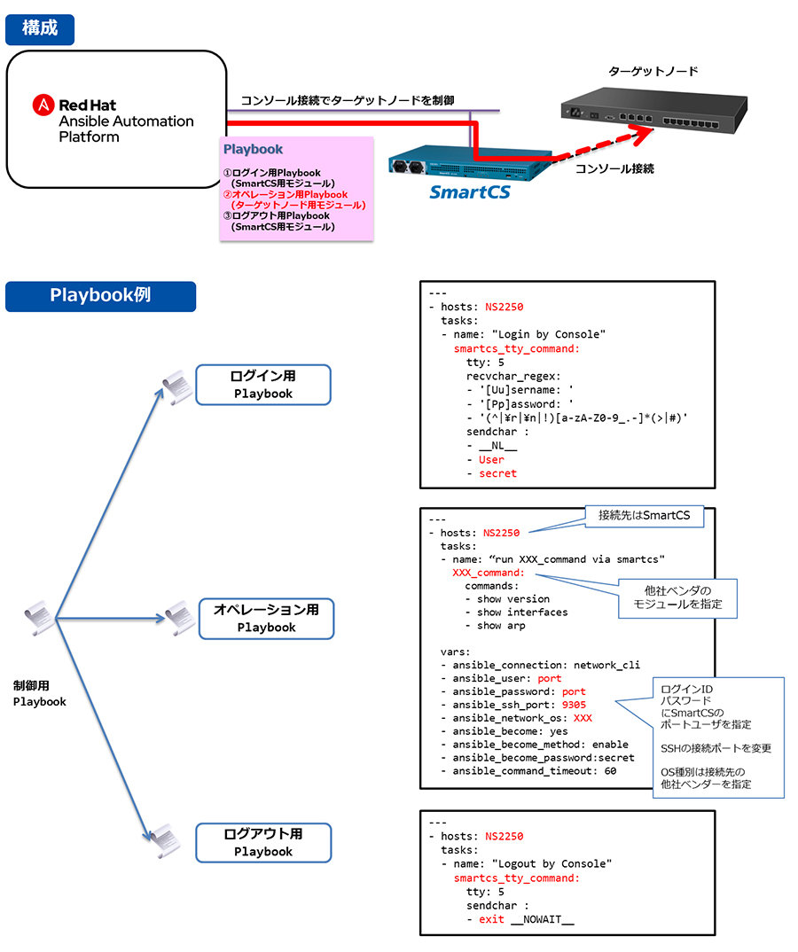 SmartCS独自のモジュールを利用して運用自動化を導入する際には、他社製品のコンソール経由のコマンド入出力情報を網羅する必要があり、Playbook作成が非常に複雑になっていました。そこで他社ベンダー用のRed Hat Ansible Automation Platformモジュールと当社が用意する独自モジュールを連携することで、機器の設定や監視をするためのPlaybook作成が容易になり、環境構築にかかる負担をさらに軽減できます。これによりお客さまはあたかもIP接続で制御しているイメージでコンソール経由での制御ができるため、SmartCSでの運用自動化の設計が容易になります。