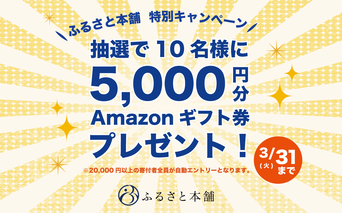 ・内容:期間中「ふるさと本舗」にて、20,000円以上を寄付した人全員を対象に、抽選で10名様にAmazonギフト券5,000円分をプレゼントいたします。