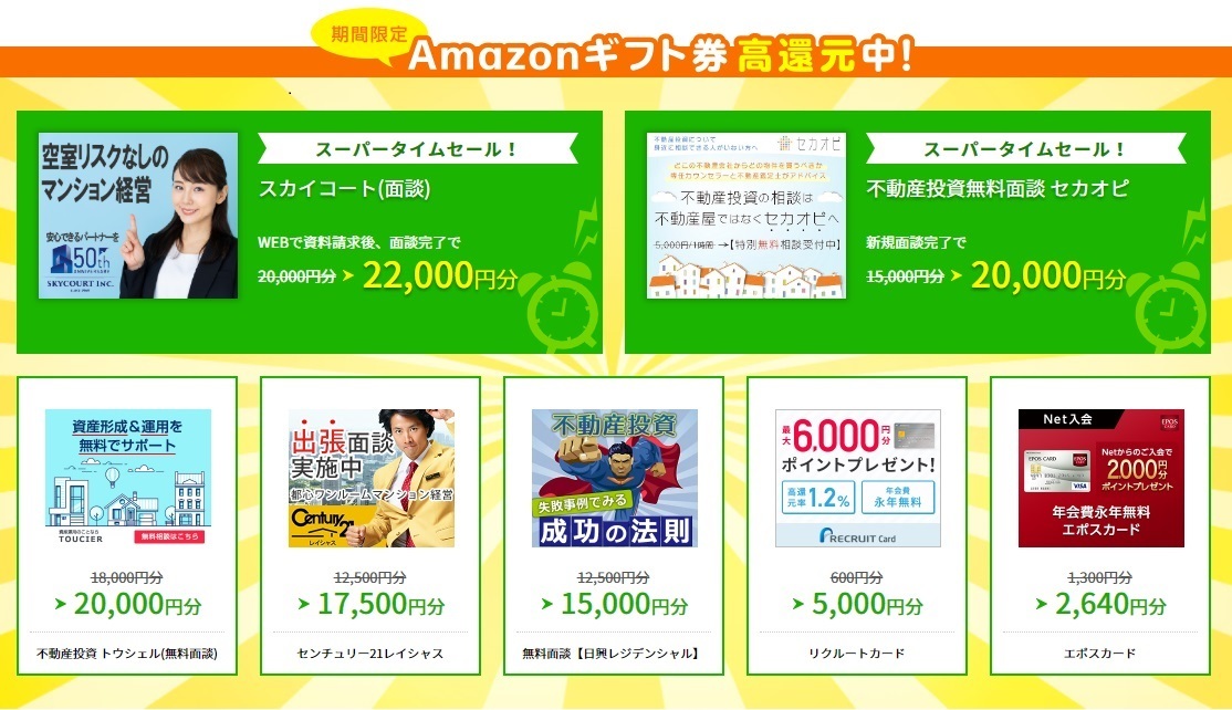 今回は、不動産投資面談の「スカイコート」、「セカオピ」、「トウシェル」、「センチュリー21レイシャス」、「日興レジデンシャル」などのサービスが高還元となっております。