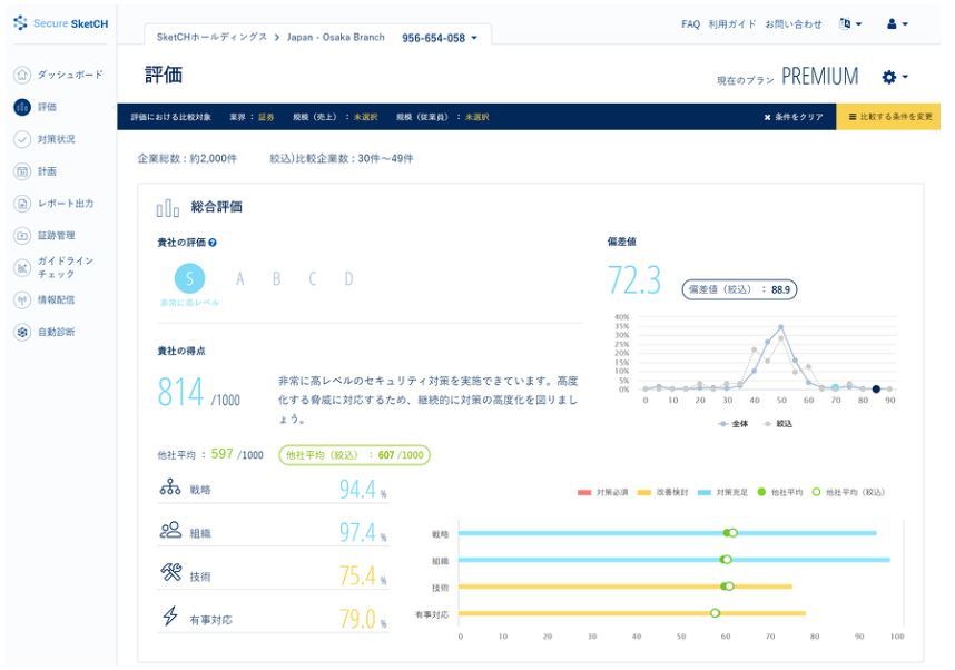 「Secure SketCH」に登録されている2,000社以上の登録データから、「業種」「売上規模」「従業員規模」などの属性で絞り込んで、セキュリティ対策のレベルについて、他社と自社の結果を比較できる機能です。従来は「業種」の分類が10種でしたが、本プランでは約30種となり、より詳細な条件で分析、比較できるようになりました。「セキュリティ対策をどの程度まで実施すべきか」を検討する際に、ベンチマークとしてご活用いただけます。