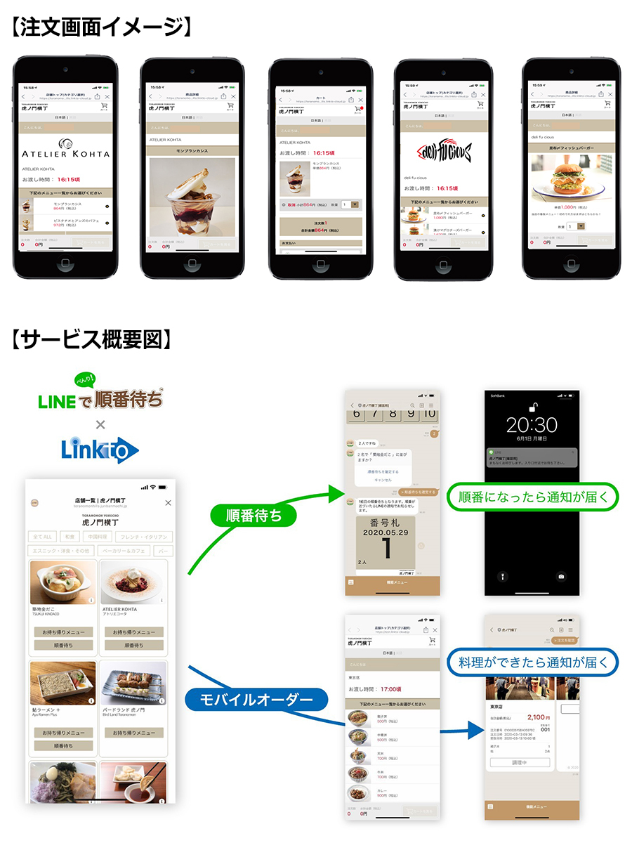 「Linktoモバイルオーダー for フードコート」と「LINEで順番待ち」を連携させることにより、利用者は順番待ちの整理券の発券や商品の注文、呼び出し通知、出来上がり通知を一つのLINE公式アカウントのトーク画面で受けとることができるシステムになっています。
