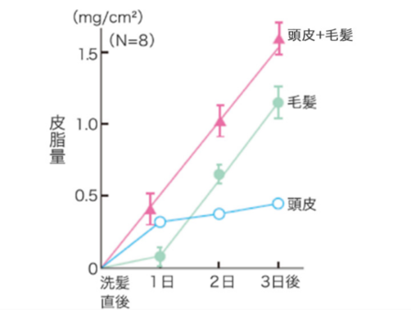 髪の毛は、頭皮から分泌される皮脂が、時間の経過とともに毛髪へ移行することにより、単位面積あたりでは衣類以上に、ほこりや花粉などの微粒子汚れが付着しやすいことが分かっています(2019年 花王ヘアケア研究所調べ。〈参考:図1・2〉)。気温や湿度などの環境、個人間での皮脂分泌量や組成によって異なりますが、特に気温が高い夏は、冬に比べ、皮脂の流動性が高くなるため、皮脂が髪へ移行しやすいといえます。そのうえ、繊維の集まりである髪(20センチの場合)の表面積は、手指表面の60倍もあると考えられることから、汚れが付着する面が大きいため汚れやすいのです。