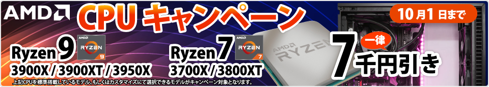 BTOパソコンメーカーの株式会社サイコム(本社:埼玉県八潮市/代表取締役社長:河野 孝史)は、AMD Ryzen 7(3800XT/3700X)とRyzen 9(3950X/3900XT/3900X)を対象にした当社のAMD搭載BTOパソコン9製品において、購入時に7,000円の値引きとなるキャンペーン「AMD Ryzen 7/9 一律7千円引きキャンペーン」を、本日9月1日(火)13:00から10月1日(木)24:00までの期間で開催します。