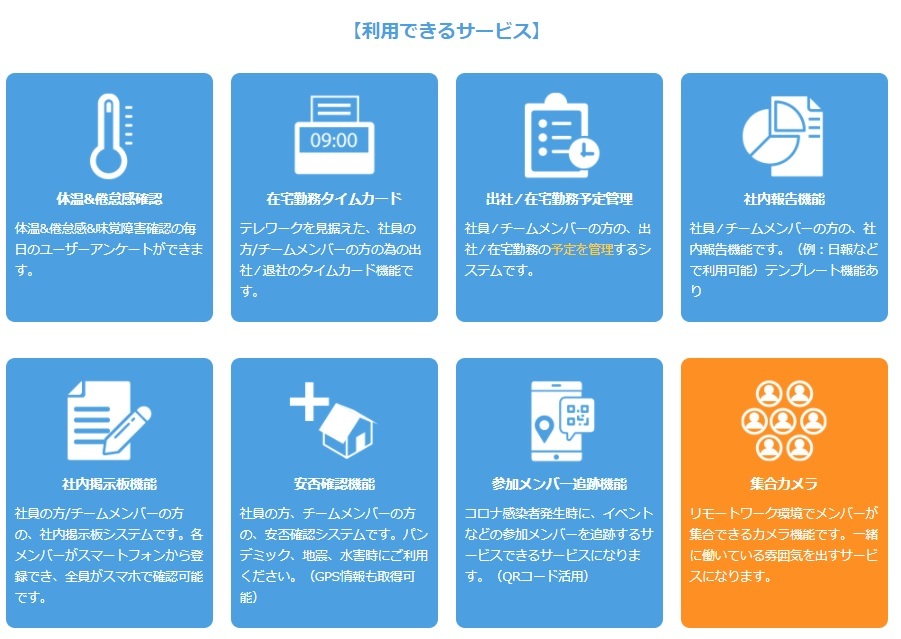 「サテライトオフィス・リモートワークツール for クラウド」は、新型コロナウイルス感染症対策支援の一環として開発しました。新型コロナウイルス感染症の収束が見えない中、企業のテレワークが長期化しています。今回は、テレワーク/リモートワーク中の企業から要望が多かった「体温&倦怠感&味覚障害確認」、「在宅勤務タイムカード」、「在宅勤務/出社予定管理」、「社内報告(日報など)」、「社内掲示板」、「安否確認」、「QRコードによる参加メンバー追跡機能」の7機能を無償で提供します。WEB版による提供のため、管理者の方はブラウザとインターネット環境があればすぐに利用可能です。社員の方はスマートフォンから回答や報告・連絡が可能です。7機能に加えて、出社している時と同じ様なメンバーの“気配”を感じてもらえる「集合カメラ」も無償で提供します。
