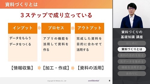 本講座では、初めて資料作りに取り組む新入社員の方などを対象に、効率的に有用な資料を作るための基礎知識を学んでいただけます。具体的な仕事の場面を想定しながら、資料づくりのポイントをインプット、プロセス、アウトプットの3つに分けて解説します。