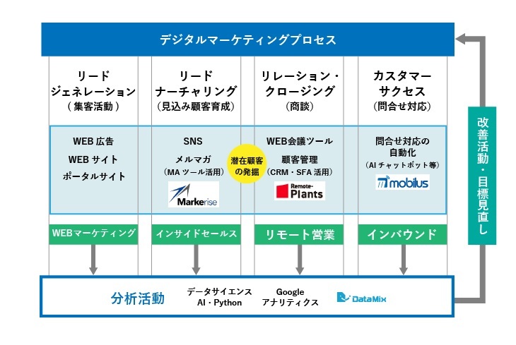 近年、営業が直接訪問で商談を行うのではなく、WEBやデジタルツールを用いて顧客の流入をはかり、データ分析をふまえて商品・サービスを訴求する、「デジタルマーケティング」が広がってきています。特にコロナ禍で対面式の顧客アプローチが難しくなっている状況下では、Webサイト、メール、SNSなどのデジタルチャネルを有効に活用し、オンラインで需要と供給をマッチングさせることが求められています。