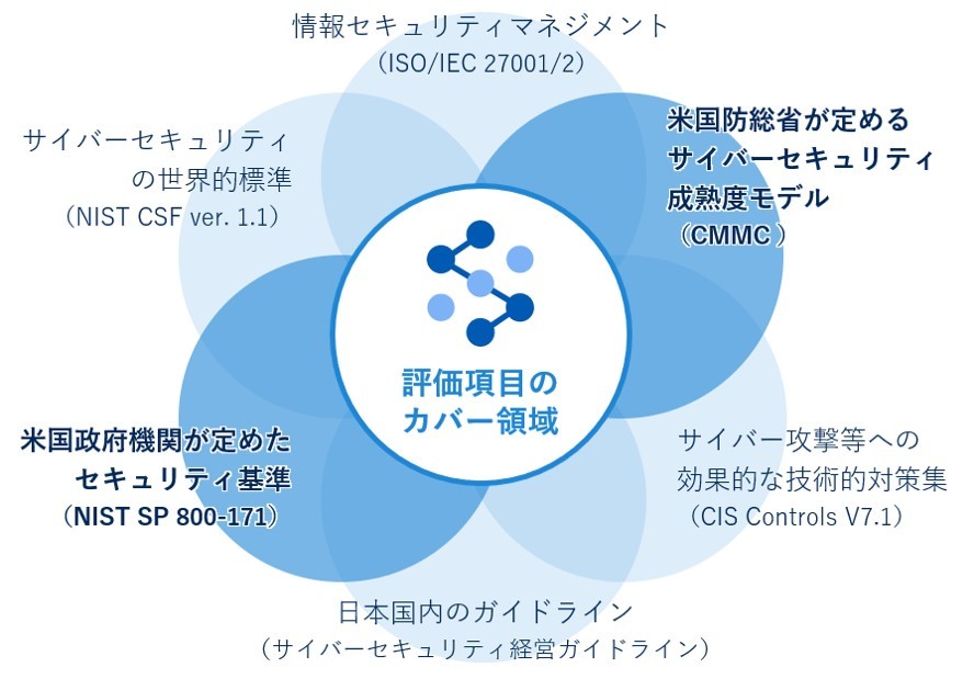 このような背景から、このたび、サプライチェーンのセキュリティ対策に対応している「米国防総省 CMMC」[vii]および「NIST SP 800-171」[viii]を、新たに追加しました。これにより、Secure SketCHの設問に回答するだけで、米国政府がサプライチェーン内の請負業者に対して求めるセキュリティ要件について、自社の準拠状況を自動的に算出・表示することが可能になります(表示イメージは、文末の「ご参考」を参照ください)。