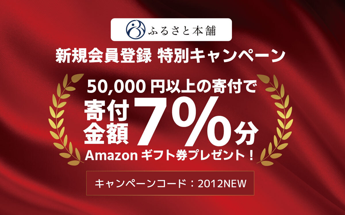 ・内容:期間中「ふるさと本舗」に新規会員登録を完了し、キャンペーンコード【2012NEW】を用いて合計5万円以上の寄付申し込みをした方を対象に、寄付金額の7%分のAmazonギフト券をプレゼントいたします。
