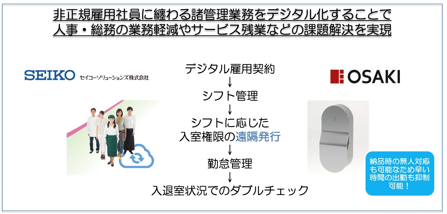 今回の協業により、セイコーソリューションズの提供する勤怠管理ソリューション「かんたん雇用契約」と大崎電気のスマートメータリング省エネソリューションや、スマートロック「OPELO」を活用し連携することで、非正規雇用社員に関する煩雑な諸管理業務を電子化、人事総務における業務軽減の実現を目指します。